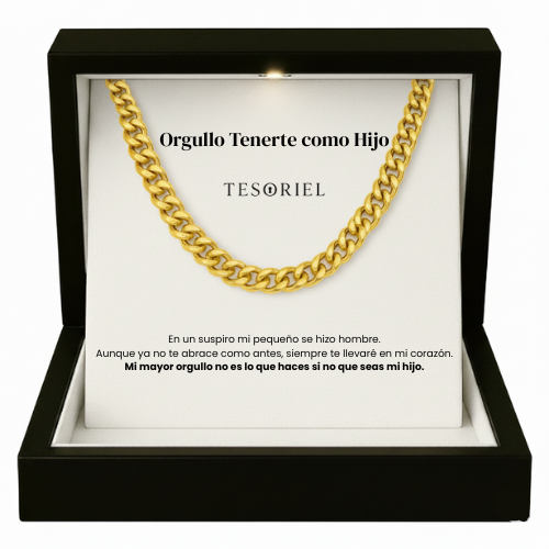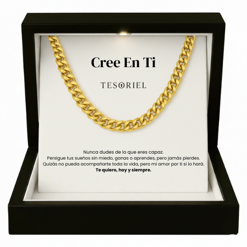 Emociónale con nuestra cadena cubana dorada, presentada en una elegante caja iluminada y acompañada de una nota dedicada que podrás elegir para transmitir tu mensaje más especial.