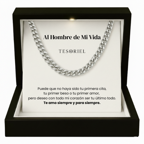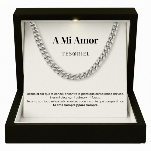Emociónale con nuestra cadena cubana, presentada en una elegante caja iluminada y acompañada de una nota dedicada que podrás elegir para transmitir tu mensaje más especial.