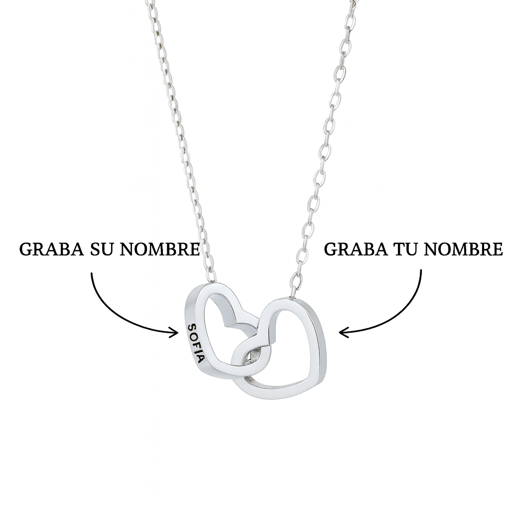 • Colgante de dos corazones entrelazados, de diseño minimalista y duradero, que representa la unión y el amor eterno, con la posibilidad de grabar nombres para hacerlo aún más especial y personal.