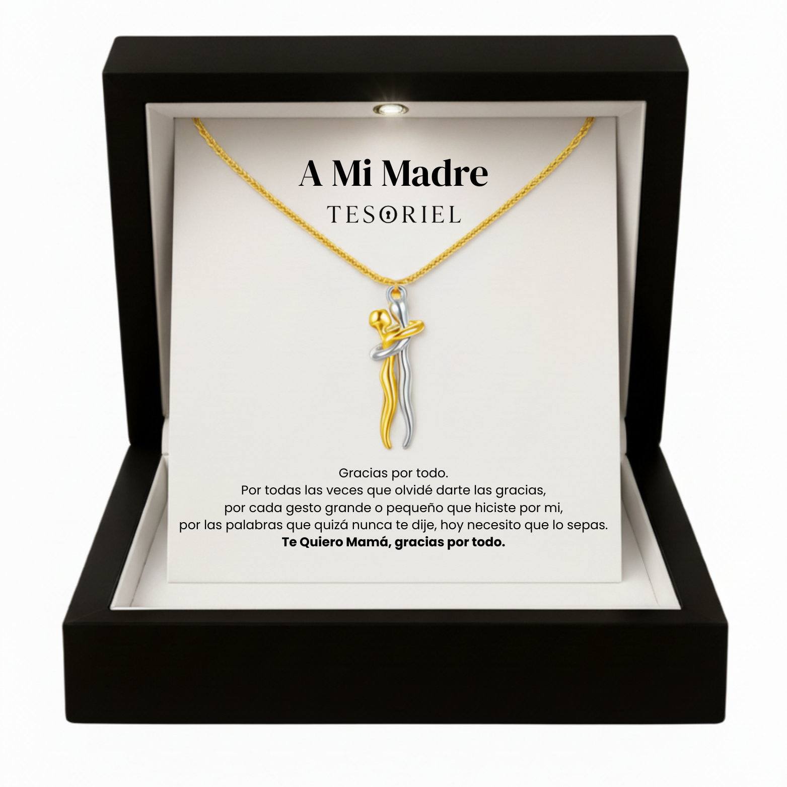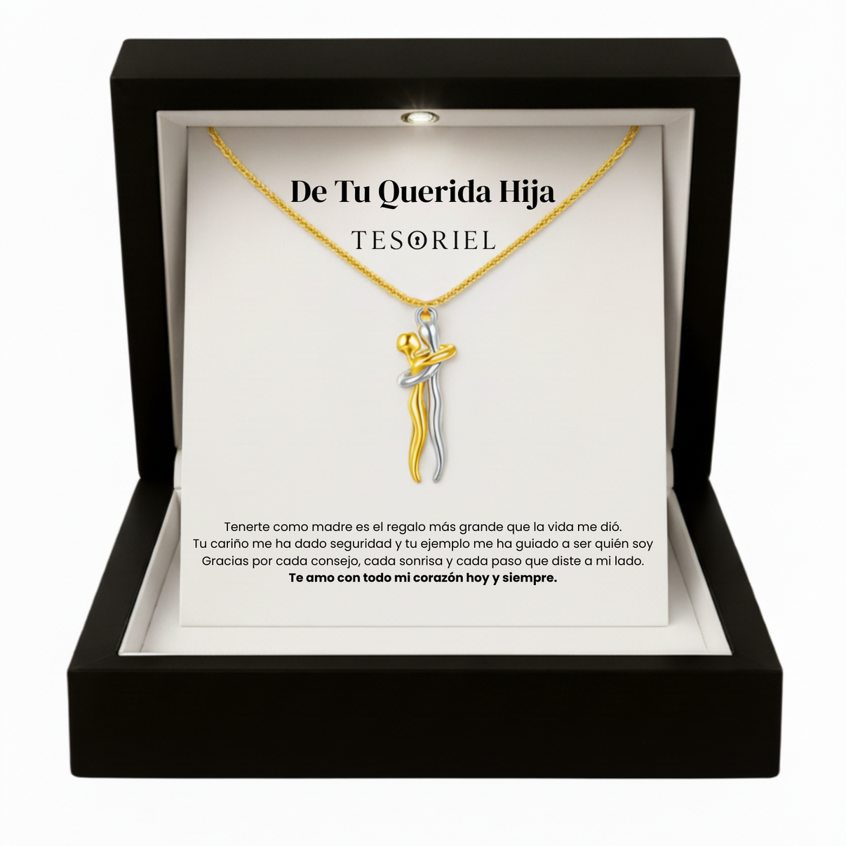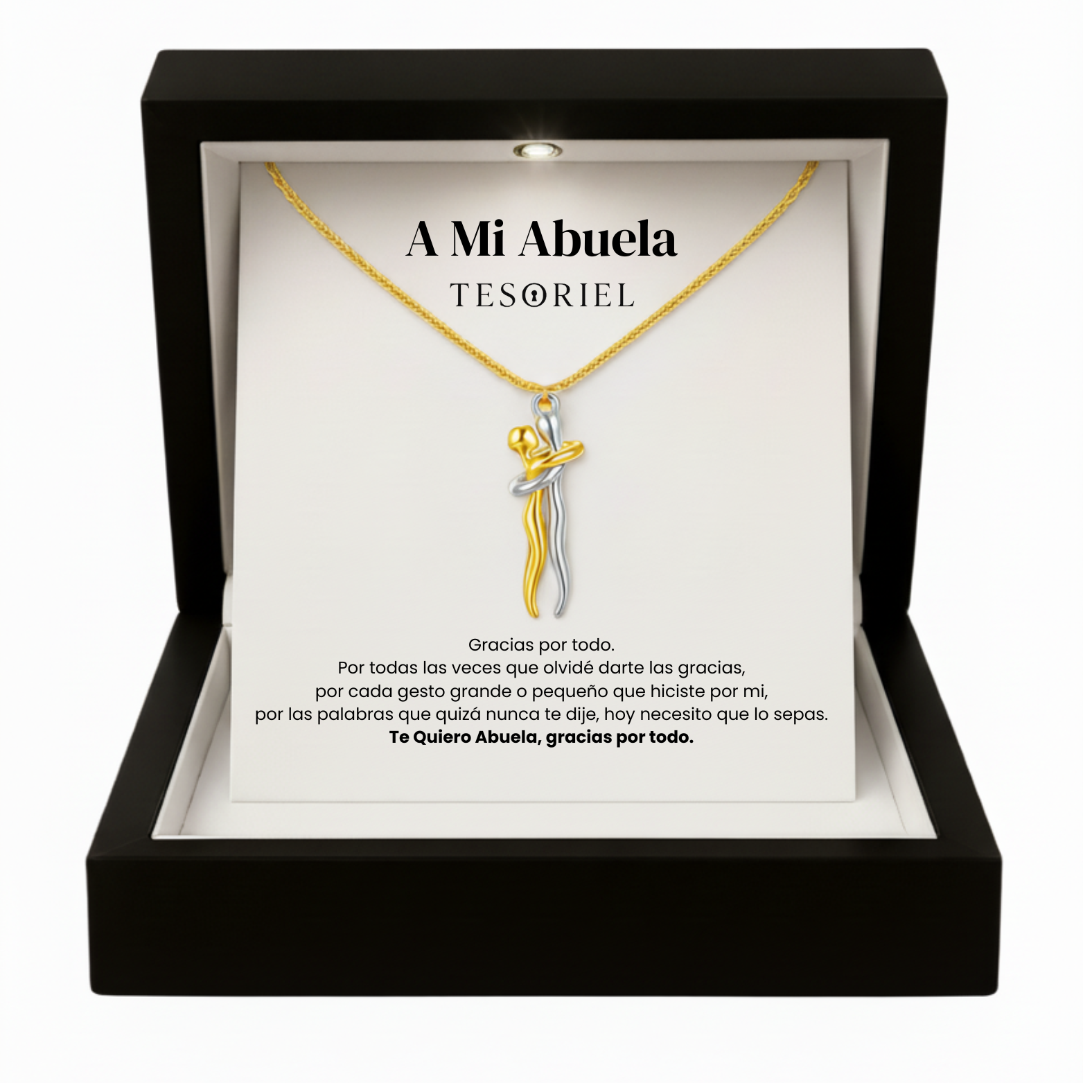 Emociónala con nuestro collar Abrazo Eterno, presentado en una elegante caja iluminada y acompañado de una nota dedicada que podrás elegir para transmitir tu mensaje más especial.