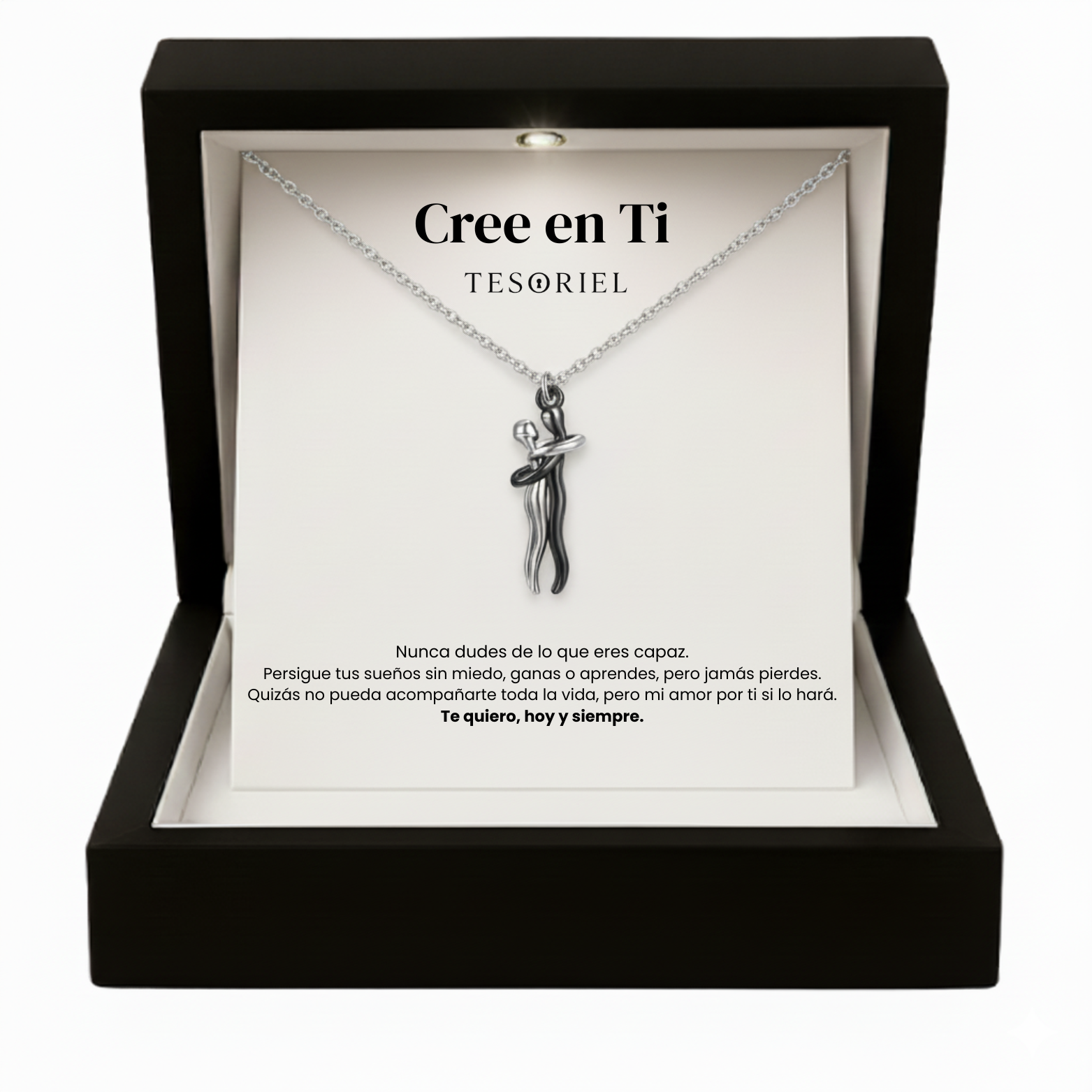 Emociónala con nuestro collar Abrazo Eterno, presentado en una elegante caja iluminada y acompañado de una nota dedicada que podrás elegir para transmitir tu mensaje más especial.