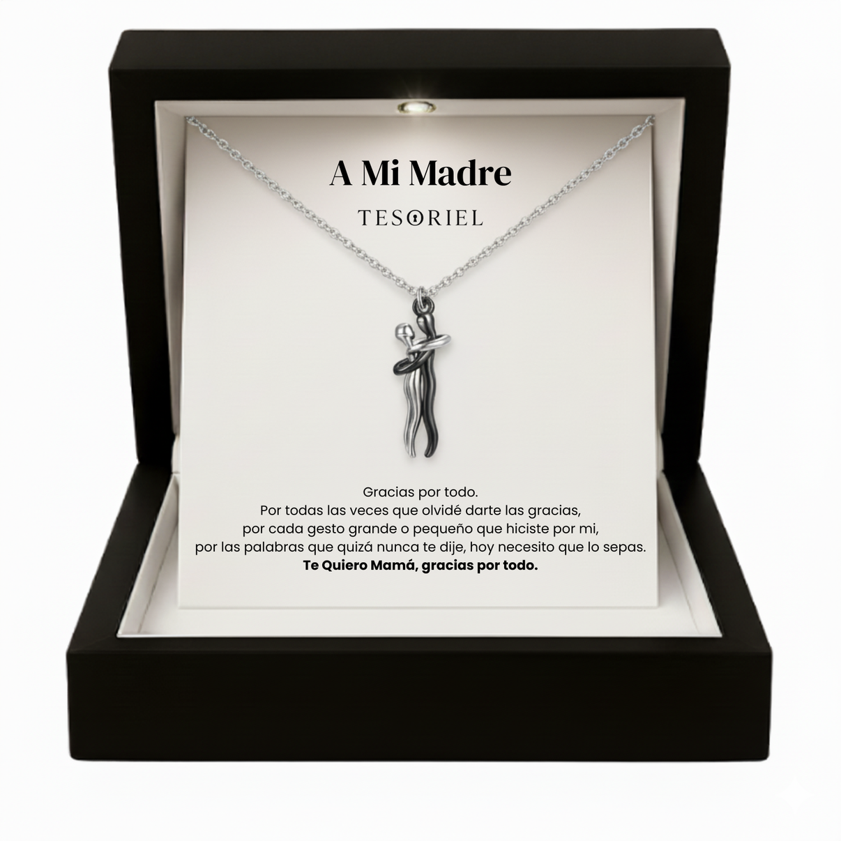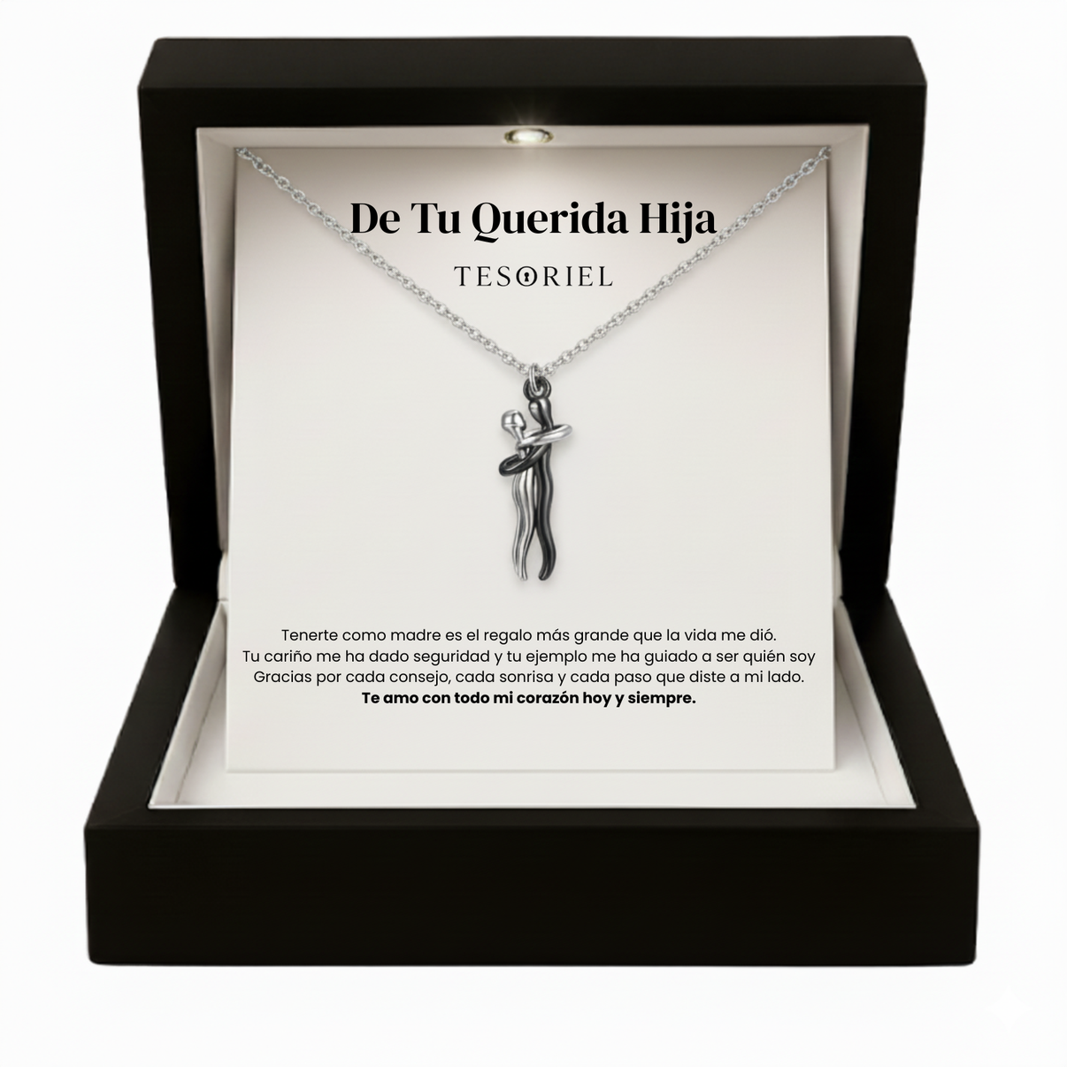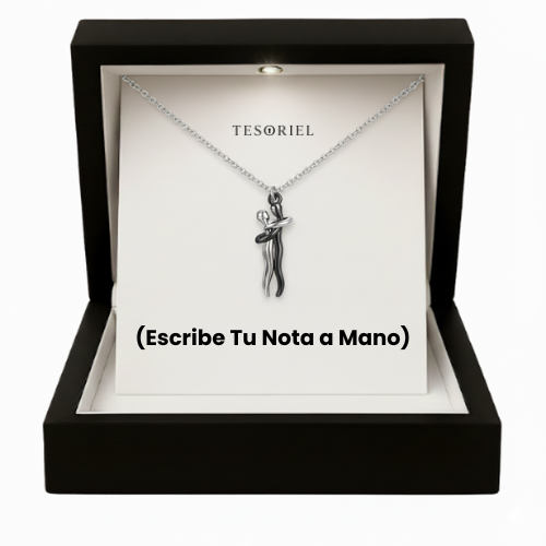 Emociónala con nuestro collar Abrazo Eterno, presentado en una elegante caja iluminada y acompañado de una nota dedicada que podrás elegir para transmitir tu mensaje más especial.