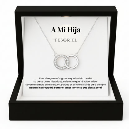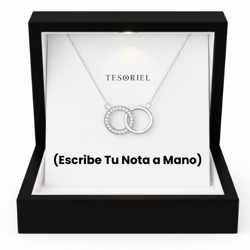 Emociónala con nuestro colgante Aros Entrelazados, presentado en una elegante caja iluminada y acompañado de una nota dedicada que podrás elegir para transmitir tu mensaje más profundo.