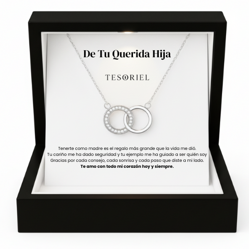 Emociónala con nuestro colgante Aros Entrelazados, presentado en una elegante caja iluminada y acompañado de una nota dedicada que podrás elegir para transmitir tu mensaje más profundo.