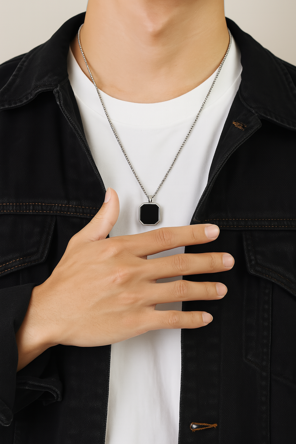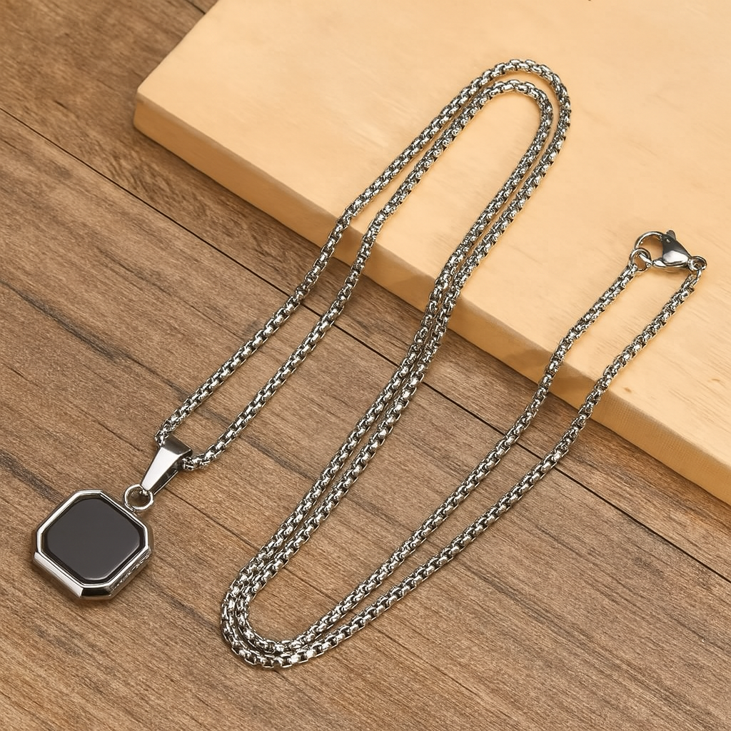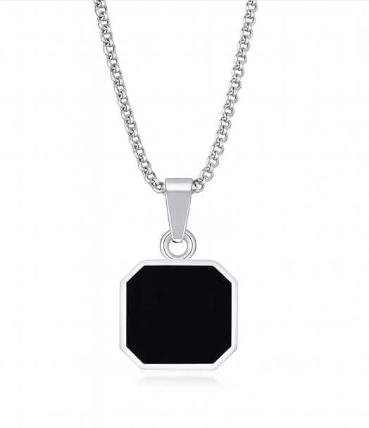 Cadena de 62 cm con un colgante negro de diseño minimalista y elegante, que aporta un toque moderno y versátil.