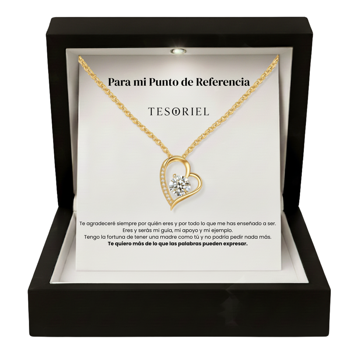 Emociónala con nuestro collar Corazón Eterno, presentado en una elegante caja iluminada y acompañado de una nota dedicada que podrás elegir para transmitir tu mensaje más especial.