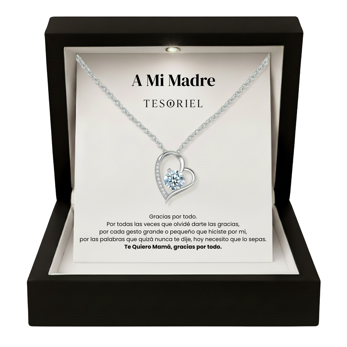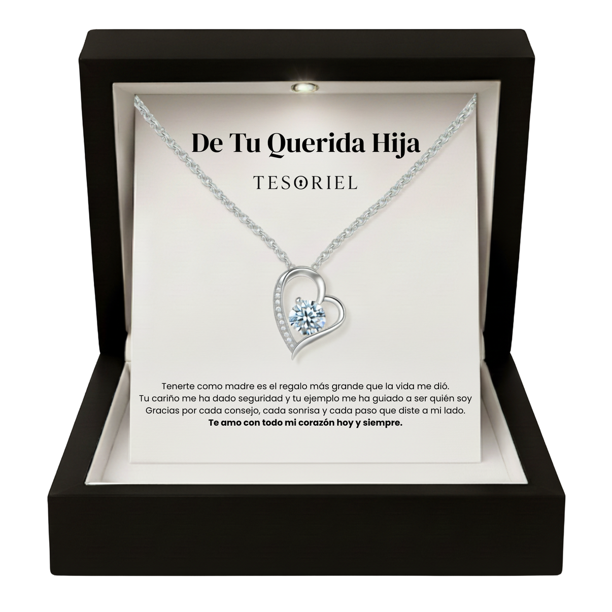 Emociónala con nuestro collar Corazón Eterno, presentado en una elegante caja iluminada y acompañado de una nota dedicada que podrás elegir para transmitir tu mensaje más especial.