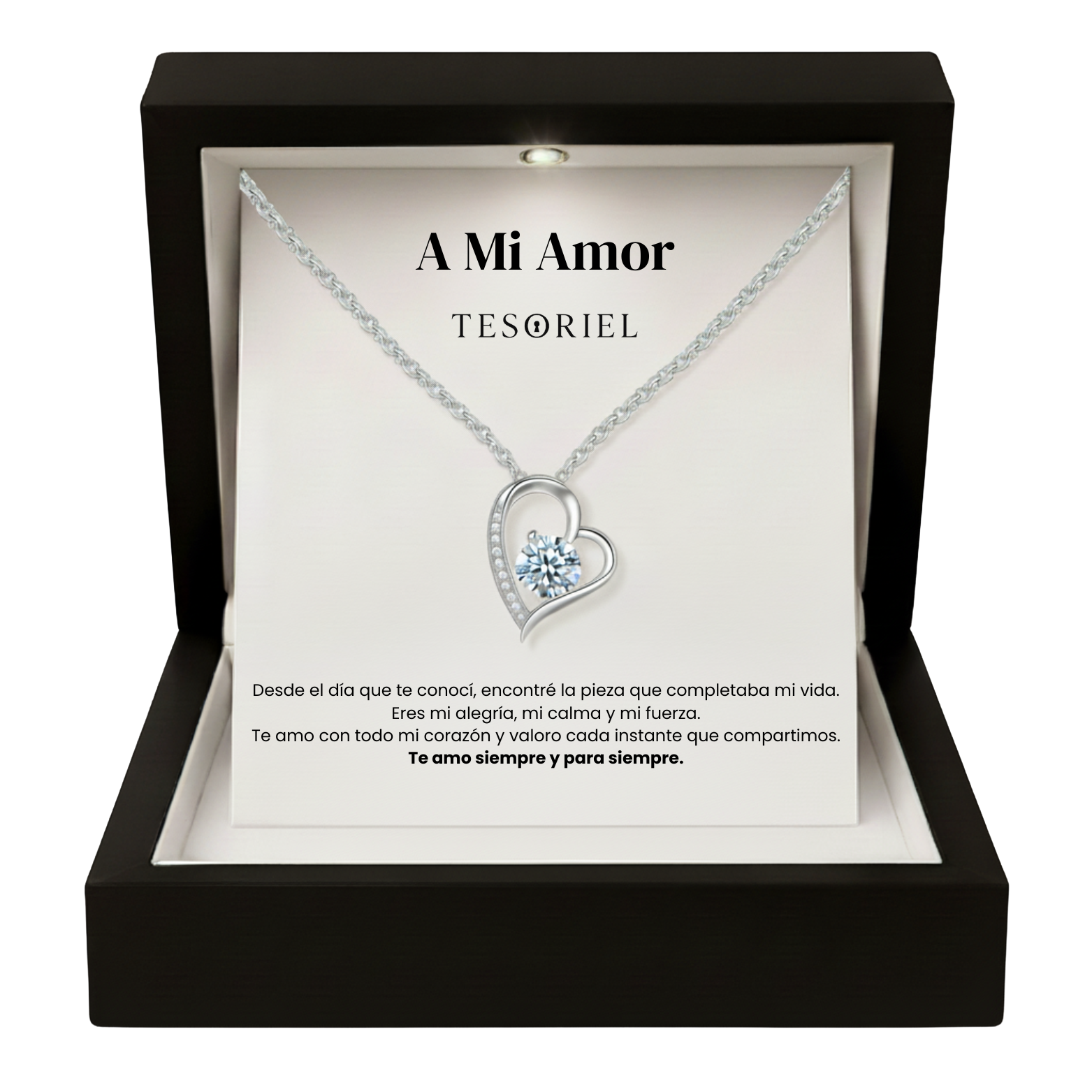 Emociónala con nuestro collar Corazón Eterno, presentado en una elegante caja iluminada y acompañado de una nota dedicada que podrás elegir para transmitir tu mensaje más especial.