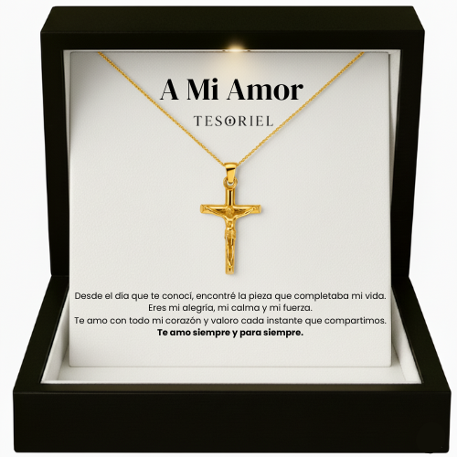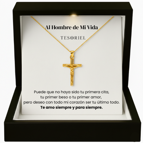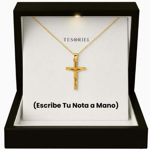 Emociónale con nuestro collar Cruz Dorado, presentado en una elegante caja iluminada y acompañado de una nota dedicada que podrás elegir para transmitir tu mensaje más especial.