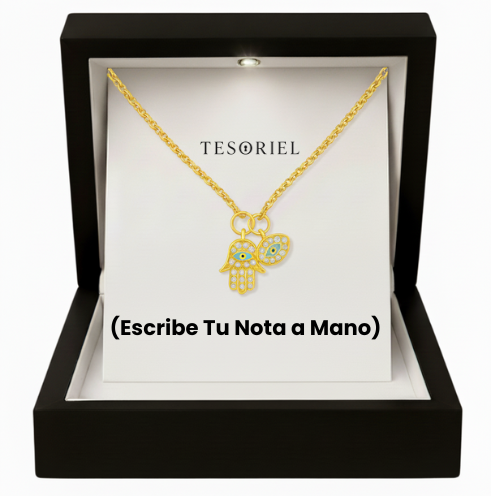 Emociónala con nuestro collar Mano de Fátima, presentado en una elegante caja iluminada y acompañado de una nota dedicada que podrás elegir para transmitir tu mensaje más especial.