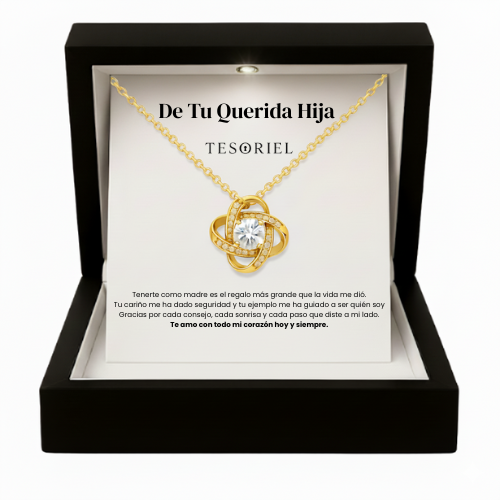 Emociónala con nuestro collar Universo, presentado en una elegante caja iluminada y acompañado de una nota dedicada que podrás elegir para transmitir tu mensaje más especial.