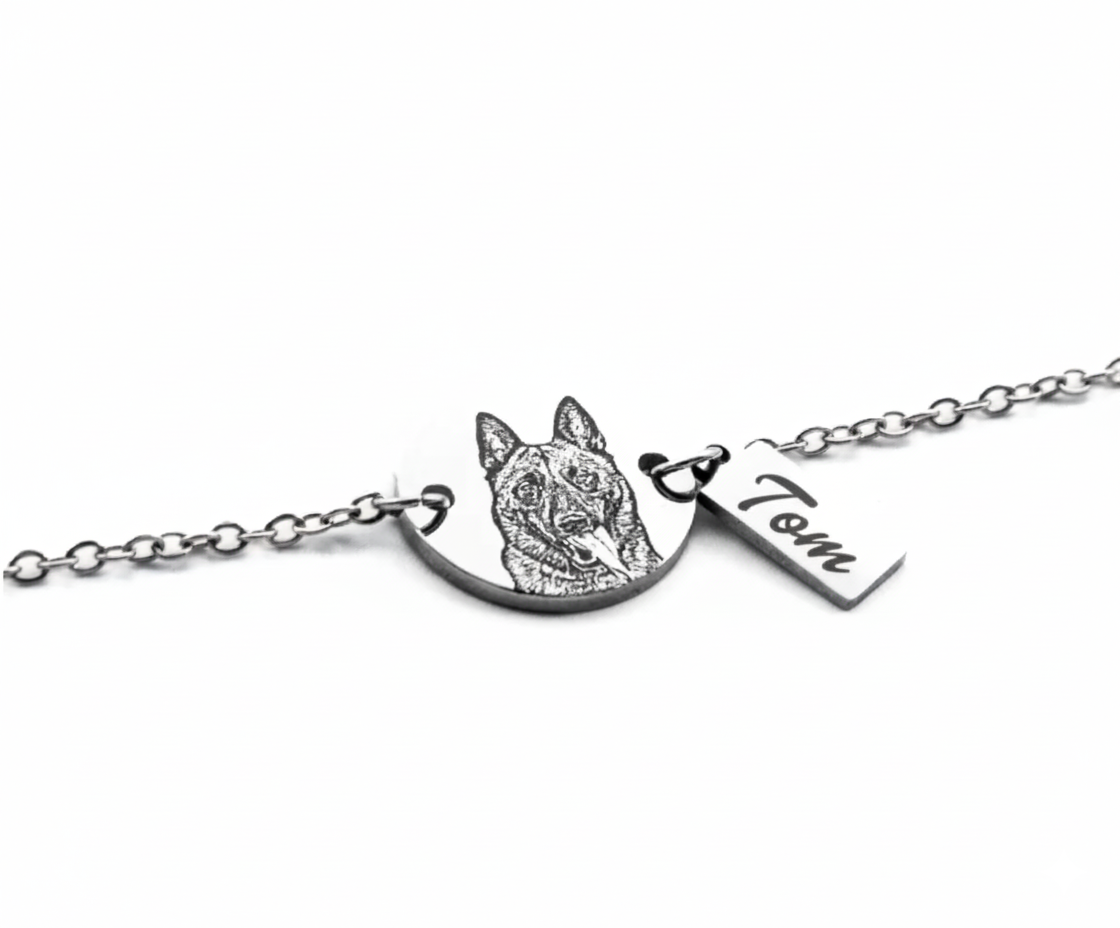 Haz eterno el vínculo con tu mejor amigo. Solo necesitas enviarnos una foto clara de tu mascota y nosotros la transformaremos en un colgante con su silueta perfectamente grabada, creando una joya única que llevarás siempre contigo.